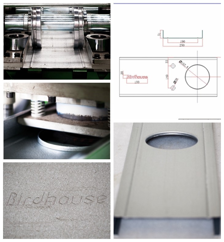 3Tons Decoiler →Roll Forming Mill(7.5kw)→ Hydraulic Cutting Device(post cutting,5.5kw)→PLC Control System→Product Rack(including 3 sets of punching mould: one for 6" dimpled round hole for HVAC, plumbing and electrical,one for 2.8" round hole,and another for customized LOGO embossing)