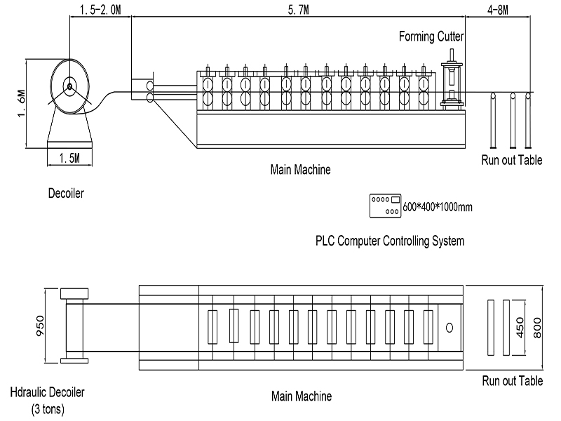 Decoiler → Feeding Guide Device→ Roll Forming Mill→ Hydraulic Post Cutter→ Exit Rack (3M)→Hydraulic System→PLC Control System